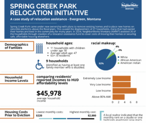 “Without the relocation funds, I would have been stuck in place receiving eviction notices I could do nothing about,” expressed a former Spring Creek resident. Many still fear what the future holds as they continue to navigate the stress and strain on their health, social connections, and financial security because of the eviction and relocation process. Residents valued the financial assistance and the trusted relationship with NeighborWorks Montana staff.
